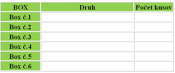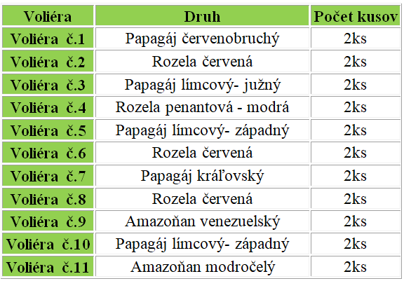 V tabuľke môžte vidieť, aké exoty chovám v jednotlivých voliérach a boxoch.